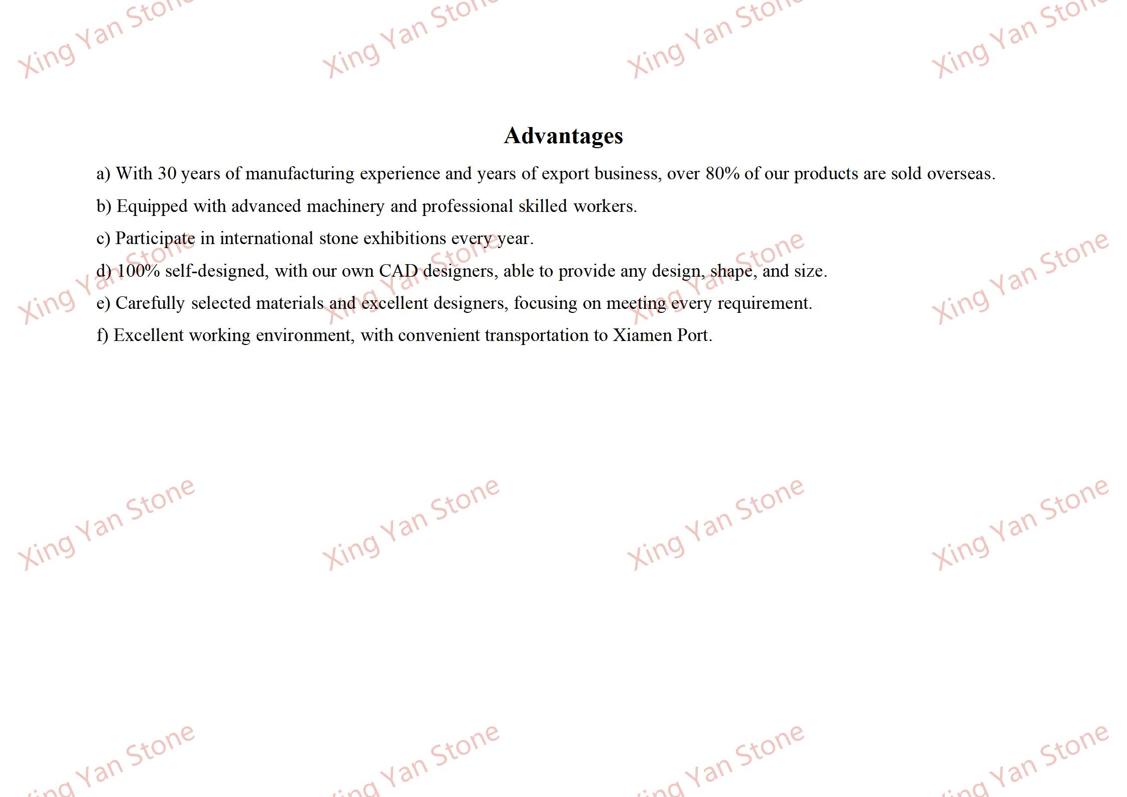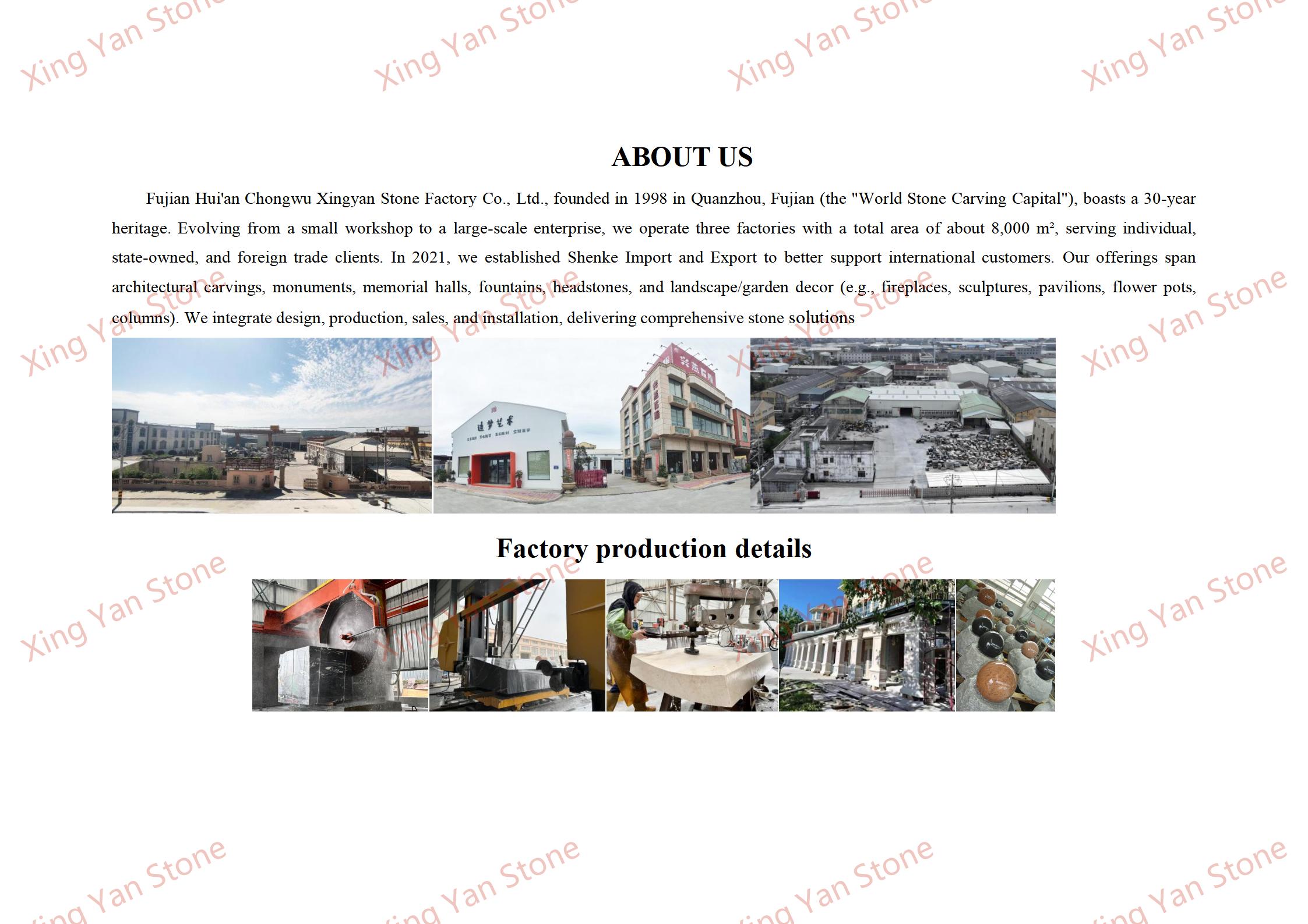 خدمات سفارشی سازی: اندازه و متریال مجسمه را می توان با توجه به الزامات تنظیم کرد (به عنوان مثال، تغییر به انواع دیگر گرانیت)، و حکاکی متن (به عنوان مثال، نام، پیام یادبود) پشتیبانی می شود.
